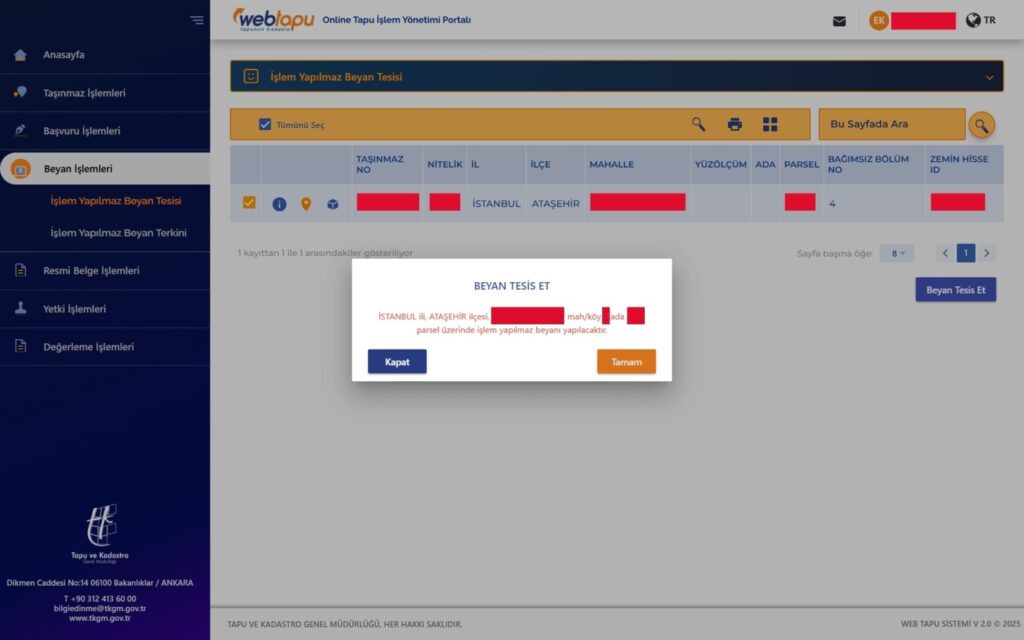 - İşlemi onayladıktan sonra, ilgili mülk “İşlem Yapılamaz Beyan Tesisi” listesinden kalkar ve “İşlem Yapılamaz Beyan Terkini” sayfasında yer alır.